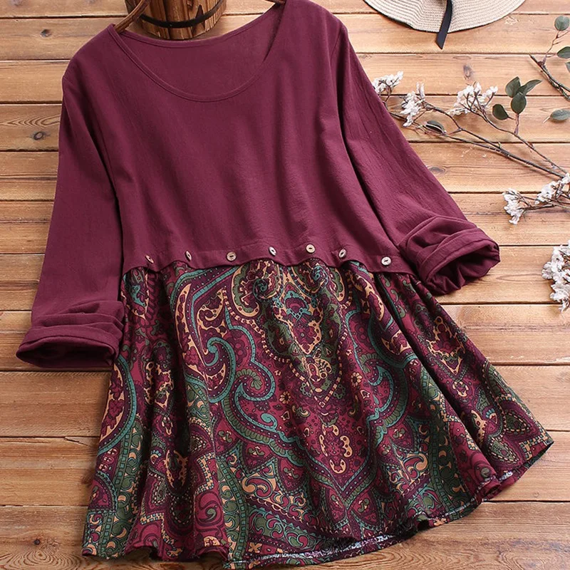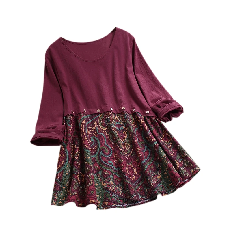 BEST Women Loose Large Size Top Summer Casual Out Women's Clothing O-Neck Flower Cotton Printed Shirt